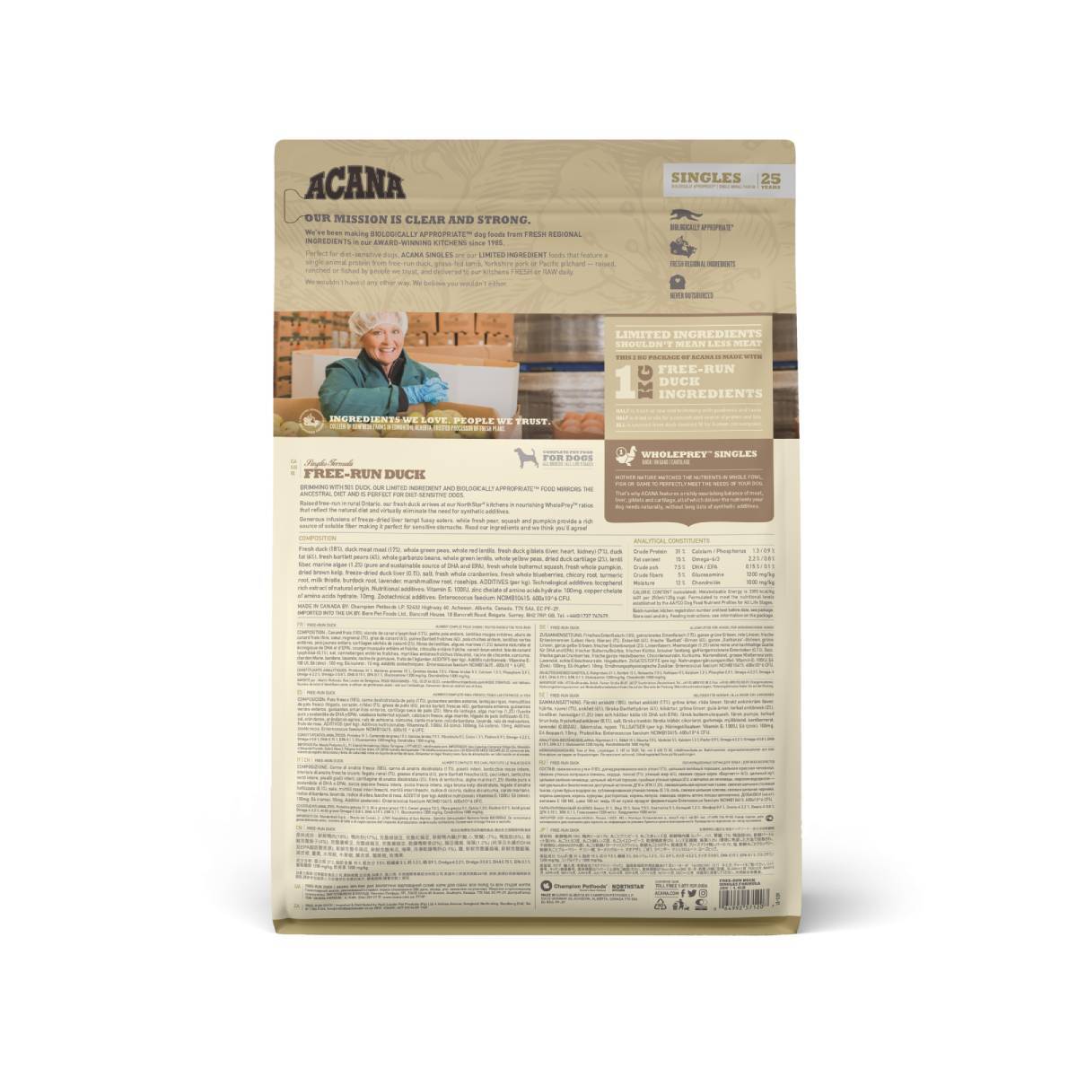 新鮮鴨肉(18%)、鴨肉ミール(17%)、丸ごとグリンピース、丸ごと赤レンズ豆、新鮮鴨内臓(レバー、ハツ、腎臓)(7%)、鴨脂肪(6%)、新鮮バートレット梨(4%)、丸ごとヒヨコ豆、丸ごと緑レンズ豆、丸ごとイエローピース、乾燥鴨軟骨(2%)、レンズ豆繊維、海藻(1.2%)(環境に考慮した方法で採取され、不純物なしのDHAとEPA源)、新鮮丸ごとバターナッツスクワッシュ、新鮮丸ごとカボチャ、乾燥ブラウンケルプ、フリーズドライ鴨レバー(0.1%)、塩、新鮮丸ごとクランベリー、新鮮丸ごとブルーベリー、チコリー根、ターメリックルート、オオアザミ、ゴボウ、ラベンダー、マシュマロルート、ローズヒップ添加栄養素(1kg中):天然濃厚トコフェロール:ビタミンE:100IU、アミノ酸水和物亜鉛キレート:100mg、アミノ酸水和物銅キレート:10mg、添加腸球菌:エンテロコッカス・フェシウム菌NCIMB10415:600×10^6CFU